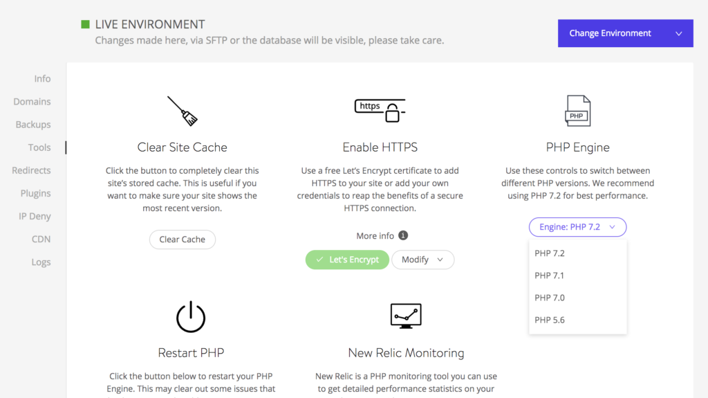 This is amazing for troubleshooting PHP related issues. Each site can be quickly changed between PHP versions 5.6, 7.0, 7.1 and 7.2. Likewise the staging site can run a different php version then production.