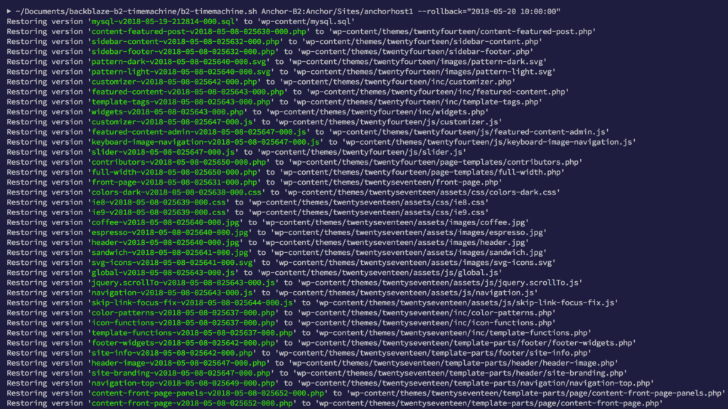 I recently switched over to Backblaze B2 to store my website backups, and it’s been a great experience. Each B2 bucket has its own lifecycle rules which determines how long to keep previous file versions. My backup B2 bucket is configured with unlimited file versions, which means my nightly incremental WordPress backups, in theory, should be fully restorable at any point in the past. While the data is all safe, there isn’t a good way to do a full time machine style restore.