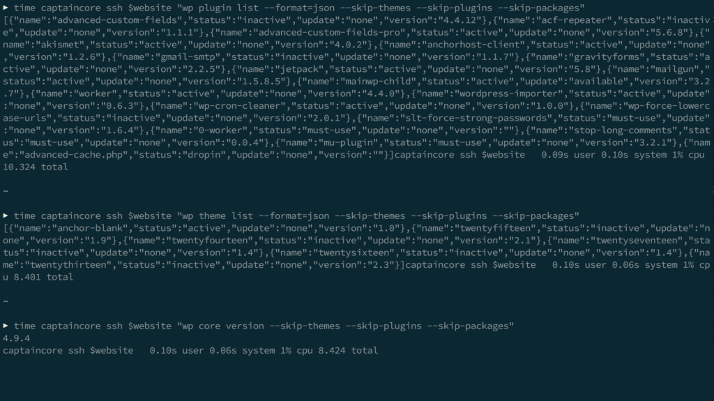 response=$( captaincore ssh $website 'wp plugin list --format=json --skip-themes --skip-plugins --skip-packages --fields=name,title,status,version; echo ""; wp theme list --format=json --skip-themes --skip-plugins --skip-packages --fields=name,title,status,version; echo ""; wp core version --skip-themes --skip-plugins --skip-packages' )