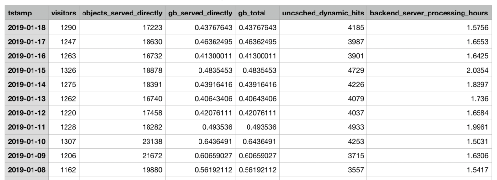 While this can be done manually through WP Engine’s portal it’s not very practical when a server has hundreds of sites. In order to automate I added a command download_usage_for_all_installs to the ruby script wpengine_portal.rb. That will automatically fetch all usage stats CSVs for an entire server. It works by running ruby wpengine_portal.rb <account-name> download_usage_for_all_installs on the command line.