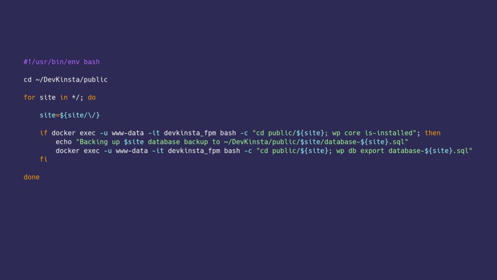 Running a backup application like Backblaze will make sure your DevKinsta site files are safe. If you think that’s enough backup coverage, think again! The databases within DevKinsta are not accessible by the file system and therefore not backed up by default. Let’s resolve this right away by creating the following backup-devkinsta.sh bash script.