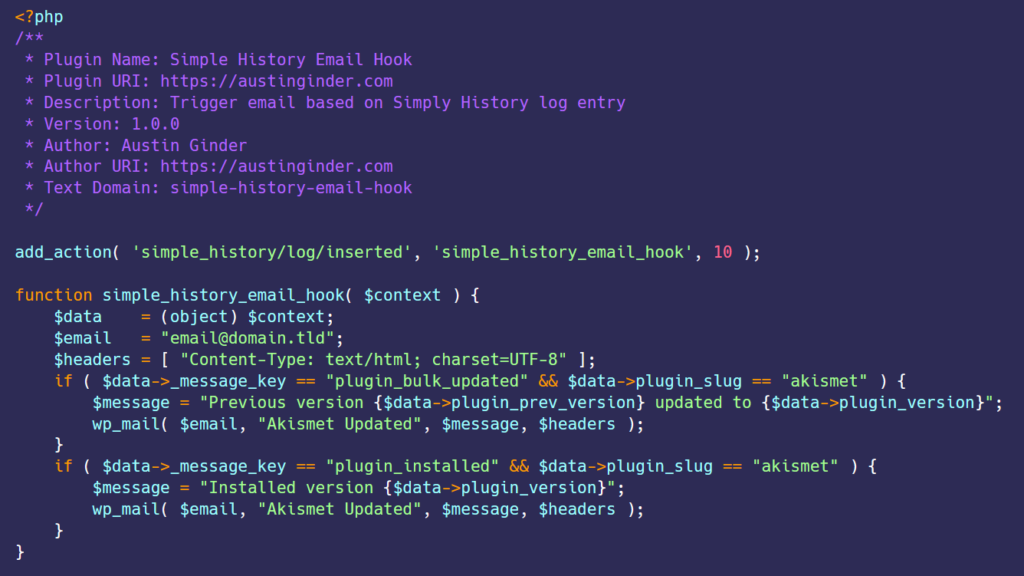 Simple History is a popular plugin for tracking changes to WordPress. With Simple History running we can check new log entries by hooking into the action named simple_history/log/inserted. To use this WordPress action let’s create a must-use plugin. Place the following code in a file named simple-history-email-hook.php within /wp-content/mu-plugins/.