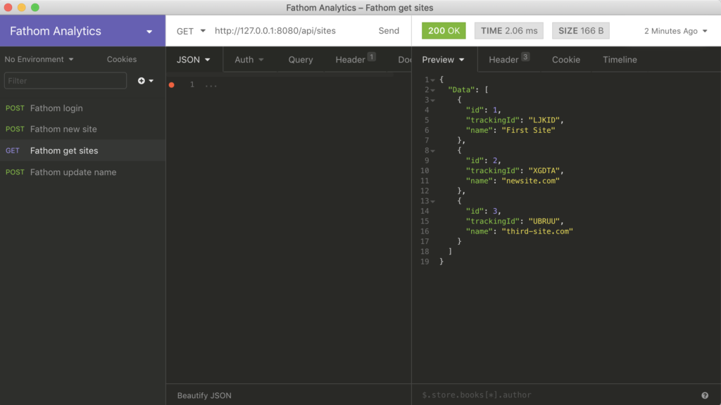 Once authenticated, you can proceed and do anything the official Fathom dashboard can do. A get request to api/sites will return a full list of sites and tracking codes.