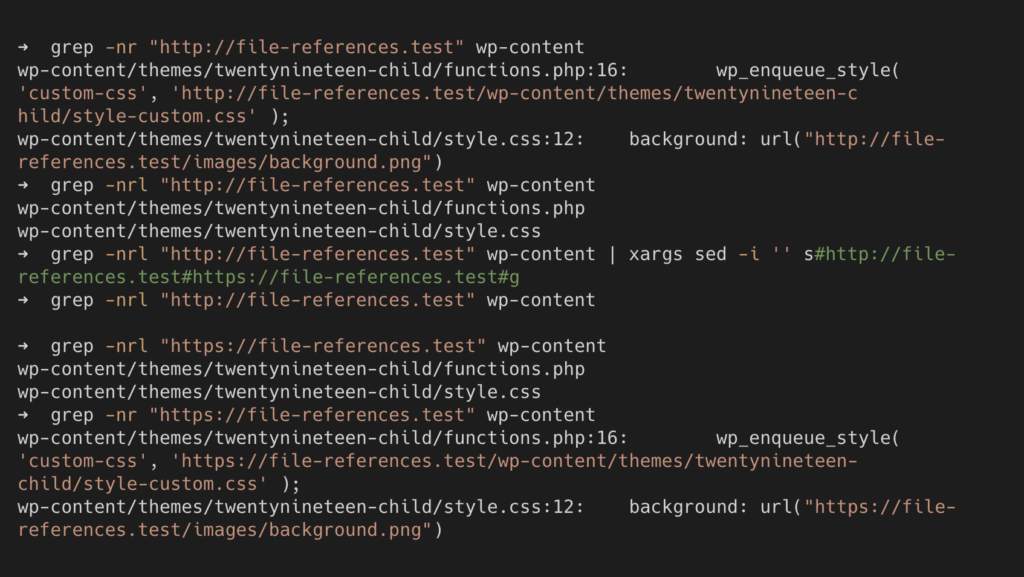 You’ll want to weed out any returned files until you have just the files returned that you actually want to update. To narrow down the selection I recommend using the argument --include "*.php" which will search for a specific file extension. You can hunt multiple file extensions at once by adding many include arguments like this --include "*.php" --include "*.css" --include "*.js". If your search is too generic then you might accidentally corrupt binary files like .pdf which shouldn’t be modified directly.