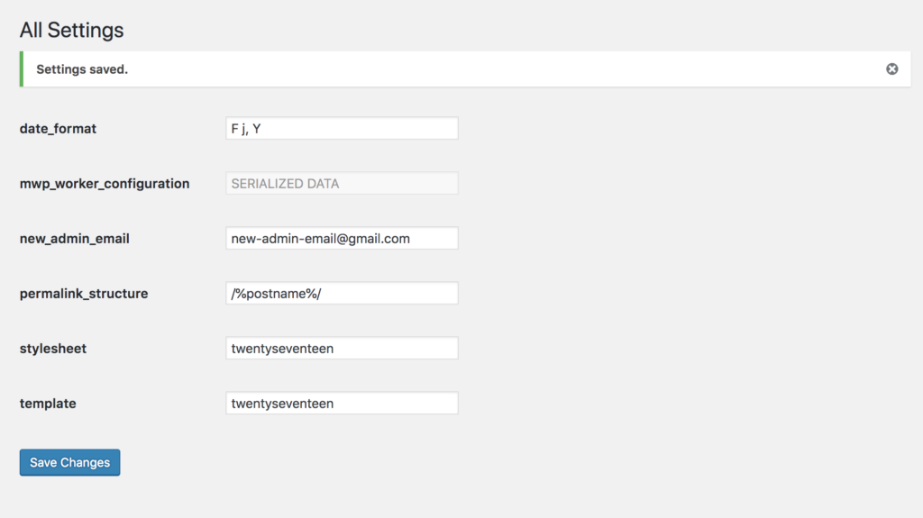 Hidden within every /wp-admin/ backend is a lonely and magical page called /wp-admin/options.php. You won’t find any links to it so, go ahead and manually remove the -general from URL of the standard Settings > General page. From this single page you’ll see everything from the wp_options database table. Now, you won’t be able to update most things due to serialized data, however the admin_email isn’t serialized. That means you can directly change the value, thus manually overriding WordPress’ built-in approval system. With that, we can quickly finish the admin email update and get on with our next email.