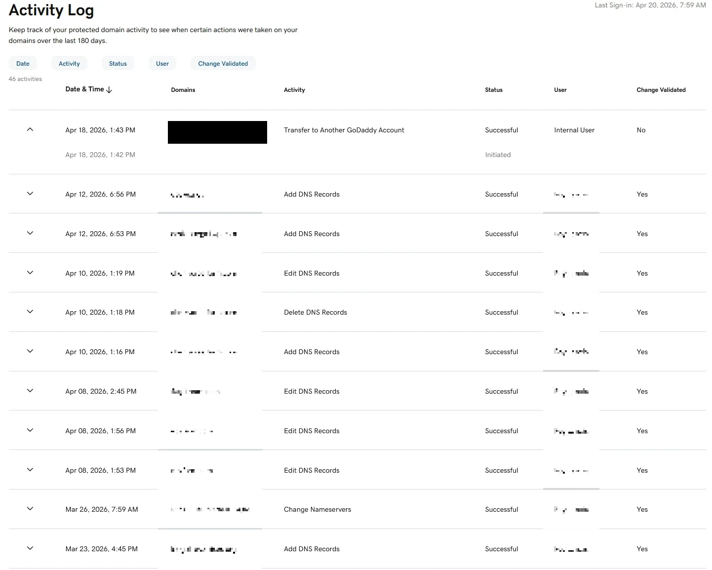 Lee is one of the most competent IT guys I know. The GoDaddy account had dual two-factor authentication enabled, requiring both an email code and an authentication app code to log in. The domain itself had ownership protection turned on. The audit log just said “Transfer to Another GoDaddy Account” by an “Internal User” with “Change Validated: No.”