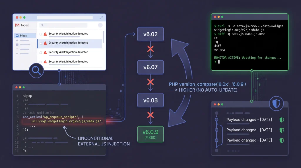 This wasn’t sophisticated malware. No backdoor, no data exfiltration. Just a sports widget loading on small business websites. But the mechanism is exactly how supply chain attacks work. Acquire a trusted plugin with 3 million downloads, inject external JavaScript, and use version number manipulation to prevent the fix from reaching affected sites.