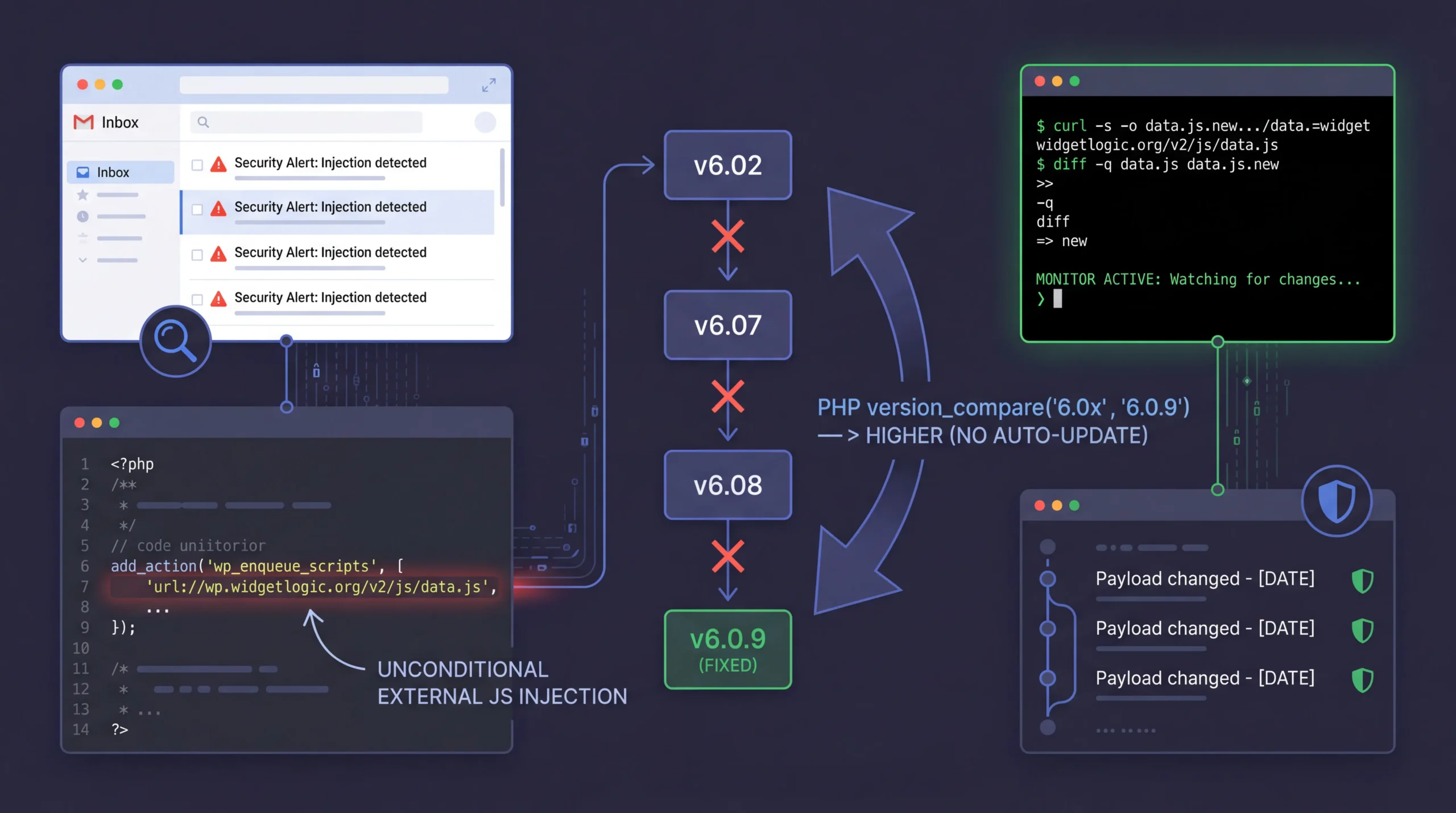 The domain widgetlogic.org was registered on June 6, 2024. Exactly two months before version 6.0.0 appeared. The new owner replaced the original single-file plugin with a multi-file structure that includes a “Live Match Widget” and a config file pointing to their domain.