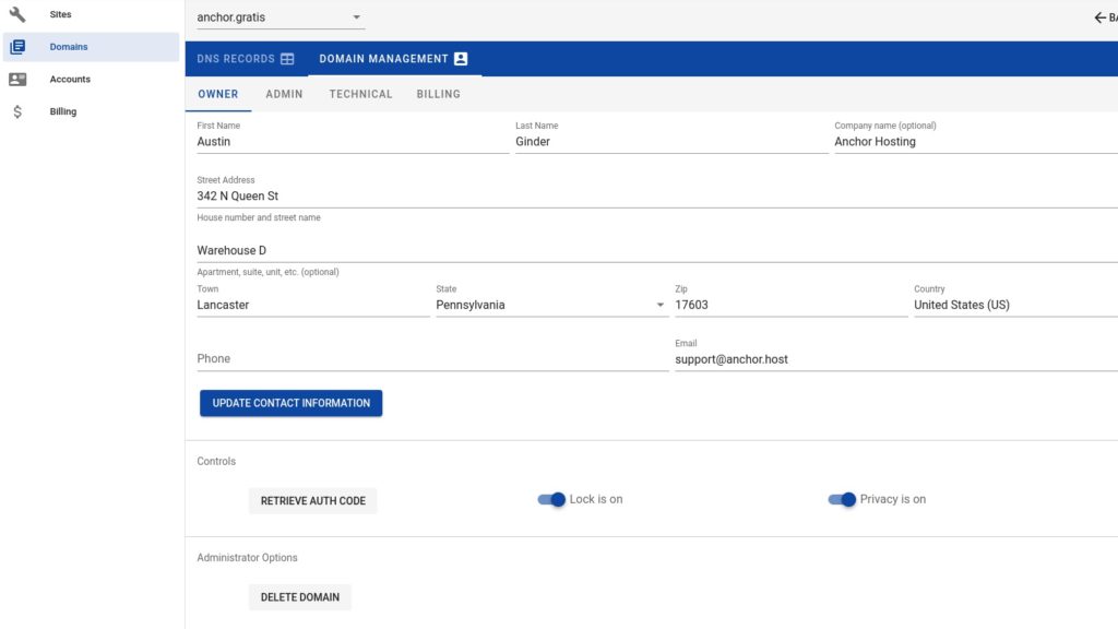 I’m really happy to be able to provide these basic controls. Purchasing new domains or transferring in existing ones will still require an email to support@anchor.host due to technical limitations with the current domain provider, Hover.com. However transferring domains away from Anchor Hosting is now doable without any intervention from us. Here’s a quick look showing how they work.