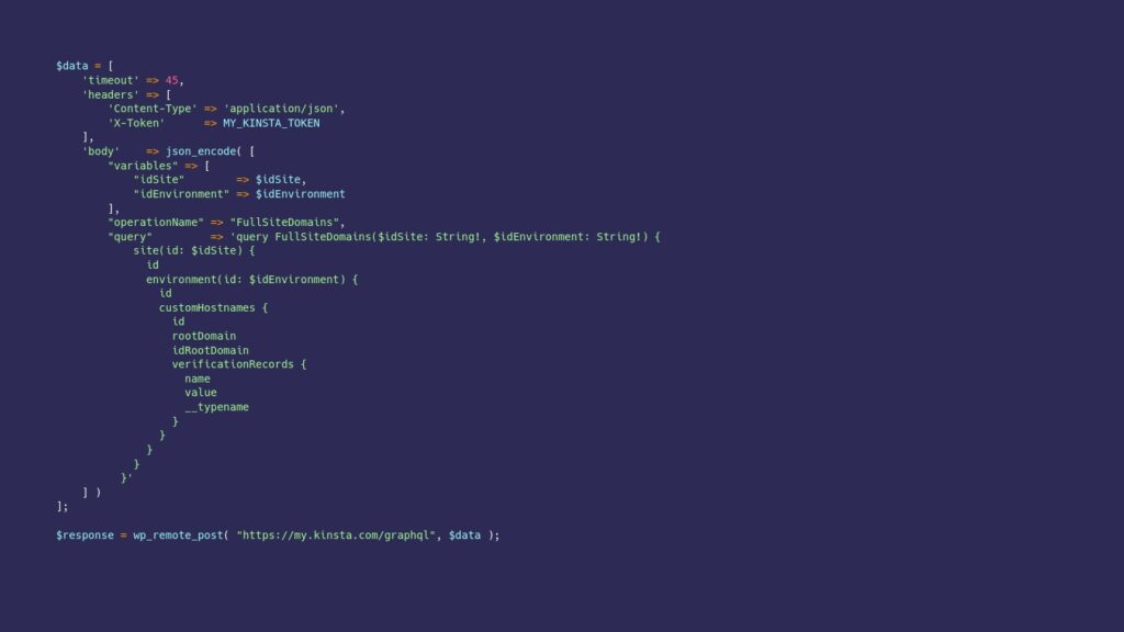 This requires a bit of understanding of how and where Kinsta stores the data. We can ask Kinsta for TXT records using the FullSiteDomains query however we first need to know Kinsta’s corresponding $idSite and $idEnvironment. For the sake of keeping this example simple, let’s just assume we know how to do that translation. We can then talk directly to MyKinsta’s GraphQL endpoint using wp_remote_post as shown below.