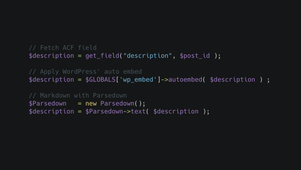 Markdown alone is quite powerful. However one thing I miss is WordPress’ automatic embeds. This lets you paste a video link on a line by itself and translate it into a playable video on the frontend. To pull this off we simply need to a few lines of PHP to the above example right before Parsedown runs. This will take the raw markdown code and run it through WordPress’ automatic embeds then pass to the Parsedown.