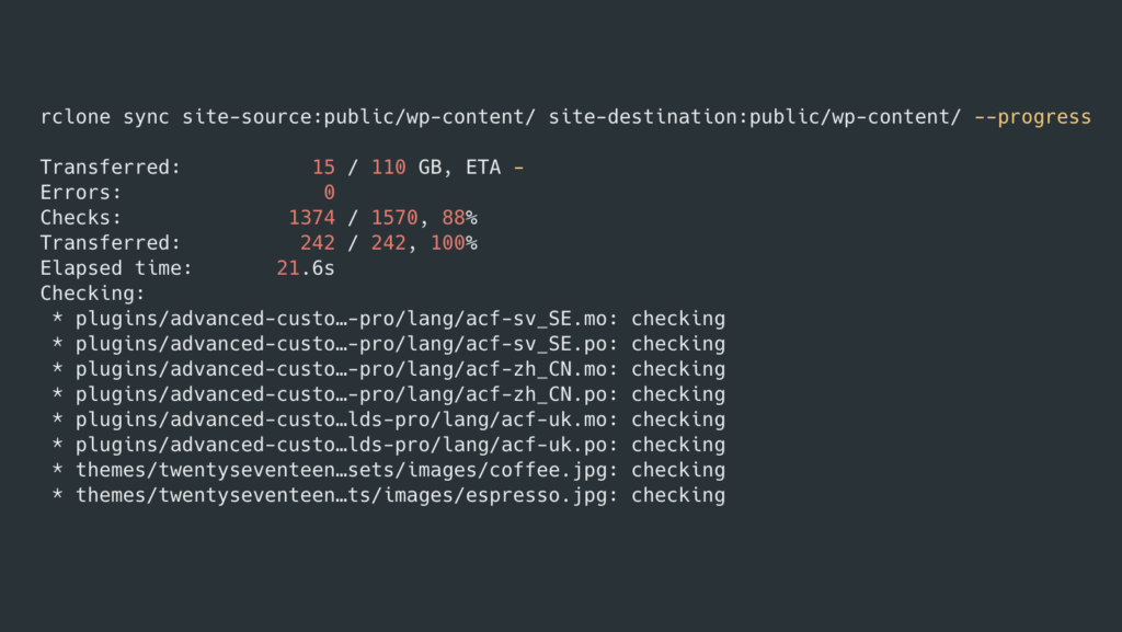 rclone sync sftp-sitename-source:public/wp-content/ sftp-sitename-destination:public/wp-content/ --progress