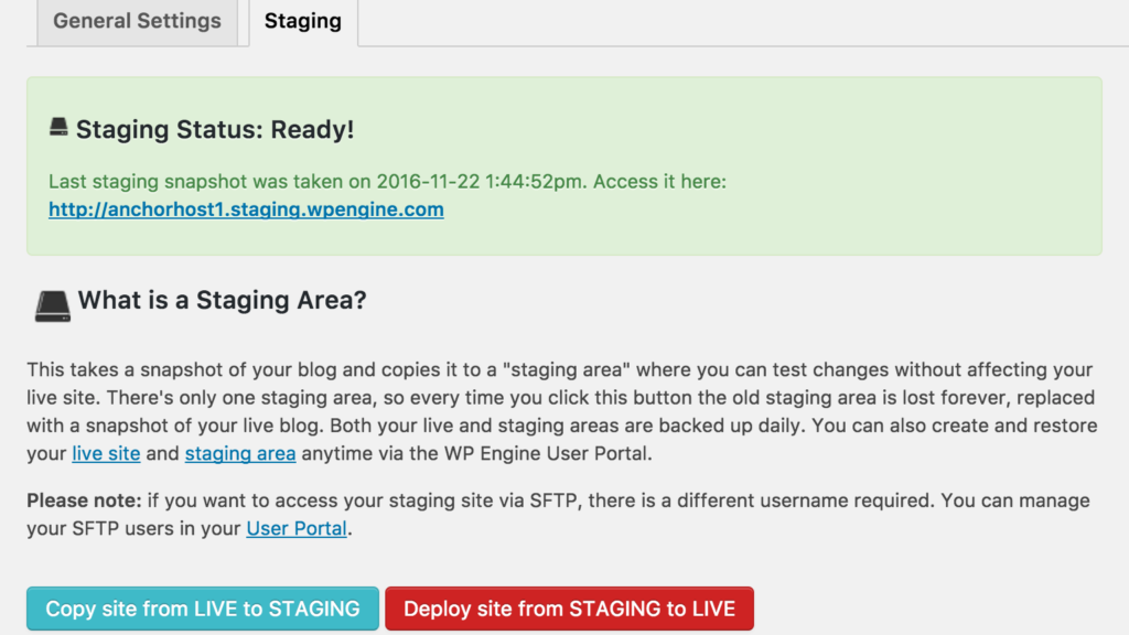 Production to staging deployments with WP Engine is a one click process. It’s all or nothing. When your ready to deploy the staging site back to production you have two options.
