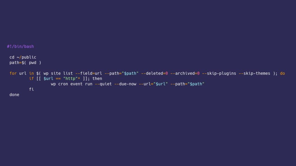 Save changes to crontab and run crontab -l to verify the new line was added. That’s it. Now each time run-wp-cli-cron-for-sites.sh is triggered, it will loop through each site in the multisite and run the cron process.