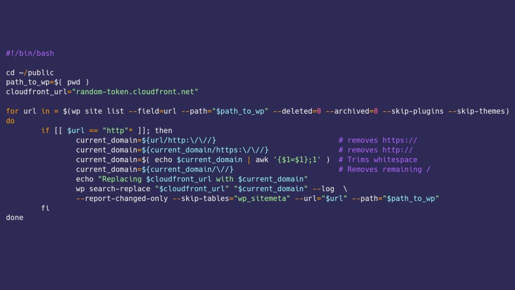 Running replace-cloudfront-references.sh loops through each site on the multisite network and runs a WP-CLI search and replace unique per each site. I did need to skip the global table wp_sitemeta so that bad references in there didn’t get changed through each loop.
