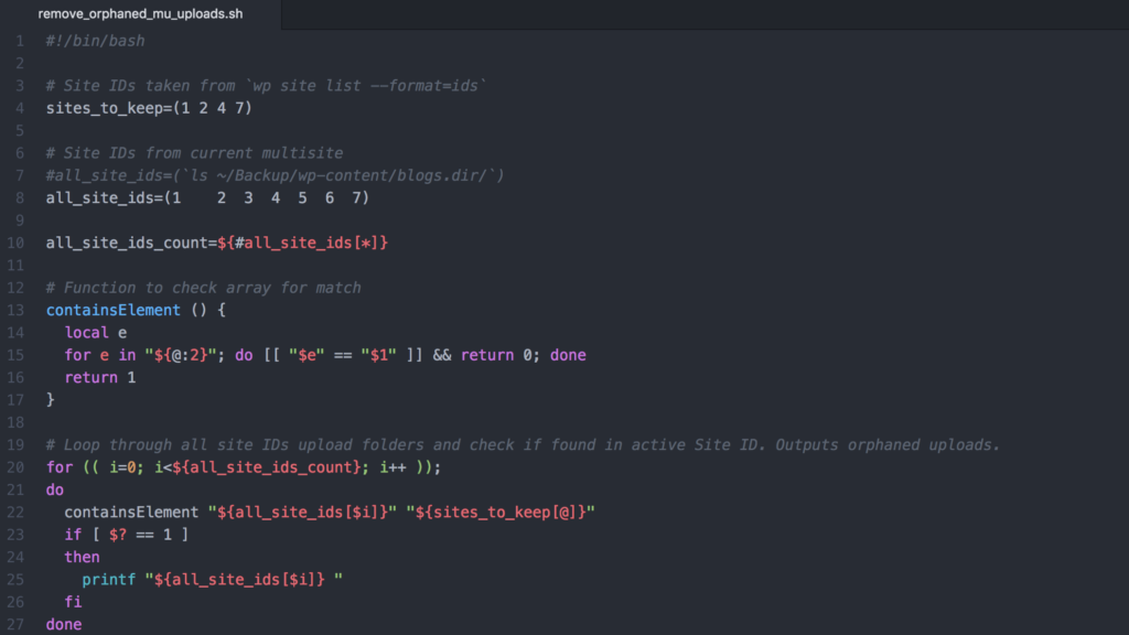 These site IDs can be copied into a new bash script we’ll call remove_orphaned_mu_uploads.sh.