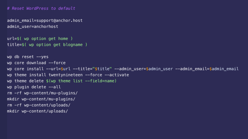 A common customer request I get is to reset a WordPress staging site back to its default state. I’ve done this manually quite a few times and decided I should just script it. The following bash script will drop all database tables, install a fresh copy of WordPress and remove all themes, plugins and uploads. The only thing that needs configured is the admin_email and admin_user in order for the WordPress backend to be accessible.