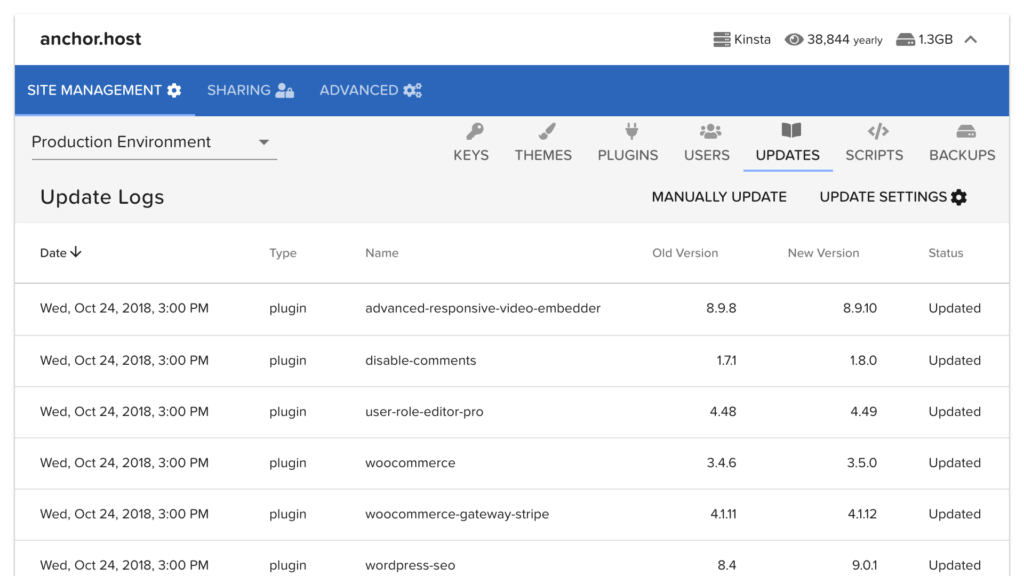 Most people use ManageWP to keep their WordPress sites up to date. If that’s you then using something like ManageWP with Anchor Hosting is not necessary. Theme and plugin updates are applied automatically each week and are now viewable within the Anchor Hosting dashboard: https://anchor.host/my-account.