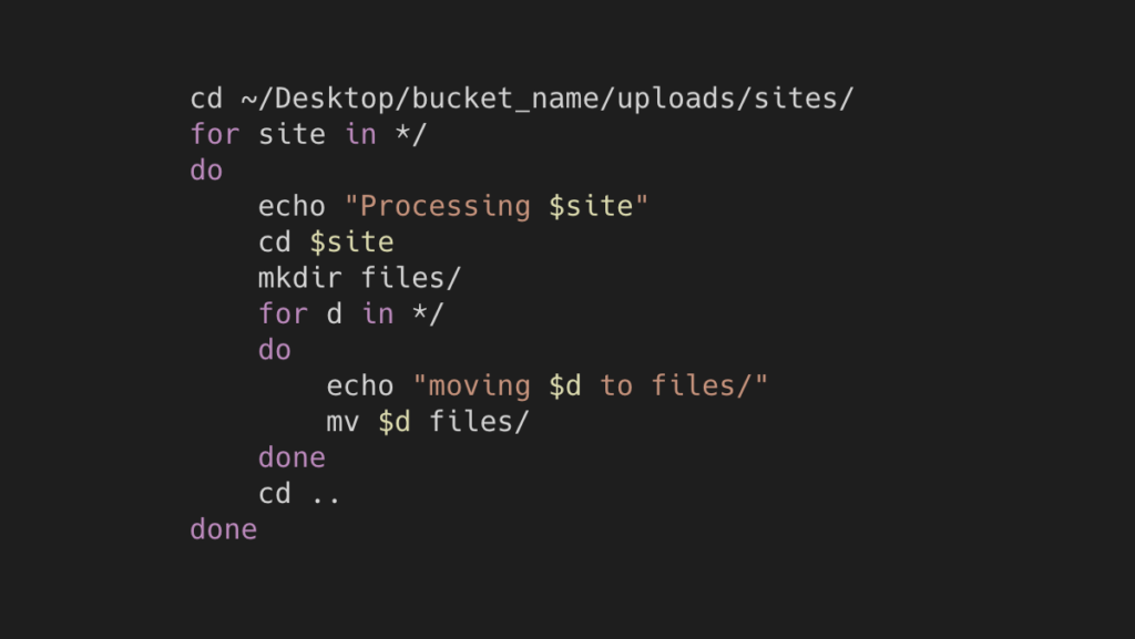 WP Offload Media stores uploaded content in the format of /sites/<subsite ID>/ which doesn’t match the legacy format of blogs.dir/<subsite ID>/files/. In order to mimic the old format the following bash script will loop through each subsite and create a /files/ folder and then move all content within that new folder.