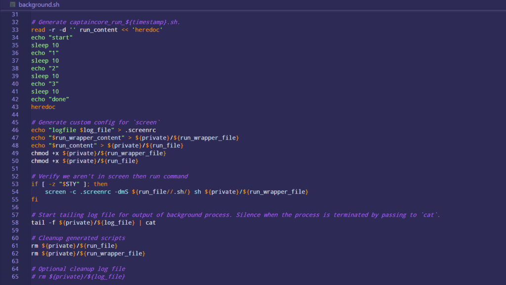 The example of counting isn’t very useful. However this wrapper template can be used for any long running script. To use simply swap out the contents of run_content with any arbitrary shell script like my over the air example of running a site migration.
