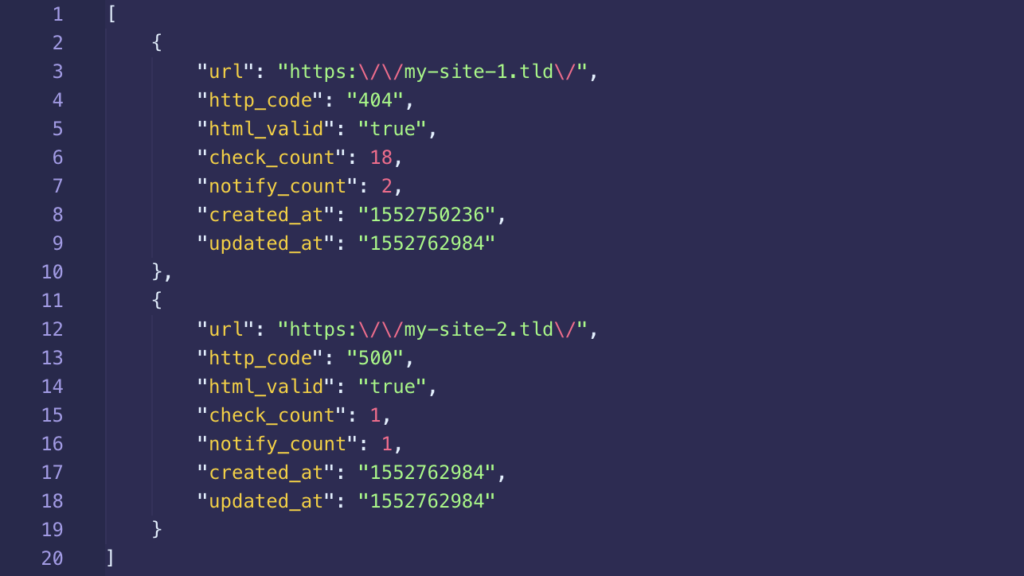 In order to add some smarts, the site monitor needs memory. I could have added a database, however I really want something super simple. I decided to stick with a single text based file monitor.json which, combined with a PHP script, operates as a crude database.