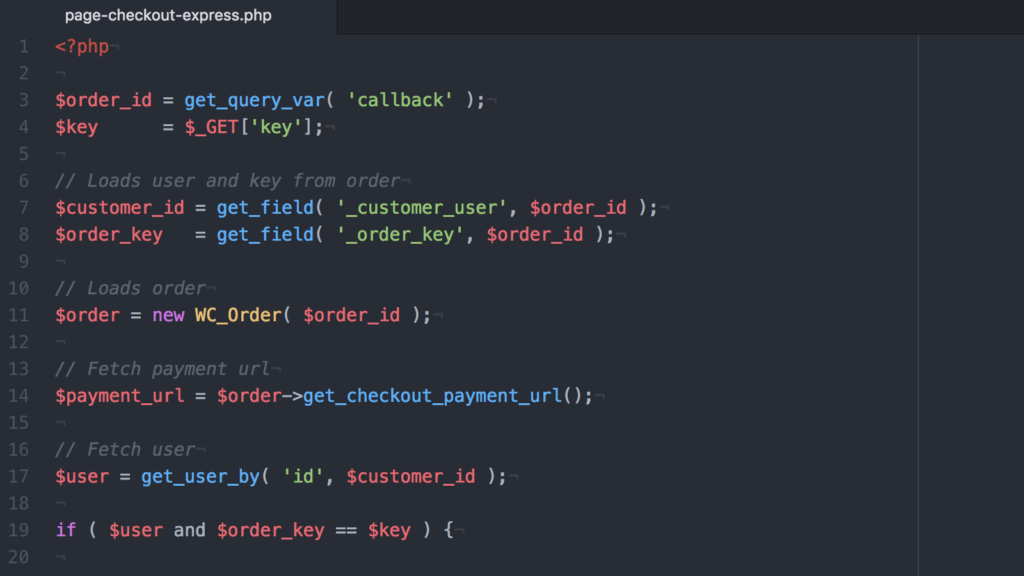 In order to complete the customization there are 2 theme files needed. The page-checkout-express.php and woocommerce/emails/customer-invoice.php. This is what my page-checkout-express.php looks like.