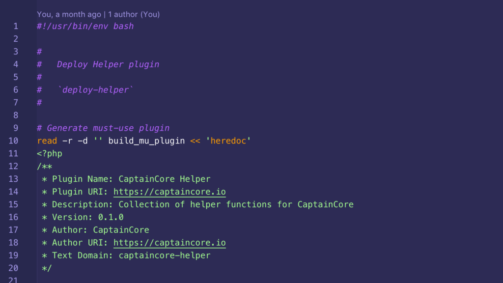 Since referencing other files isn’t possible using heredocs helps to keep scripts somewhat readable. This works well for generating mu-plugins as shown in my deploy-fathom.sh script. The PHP code for the generated mu-plugin starts out within a bash heredoc section.