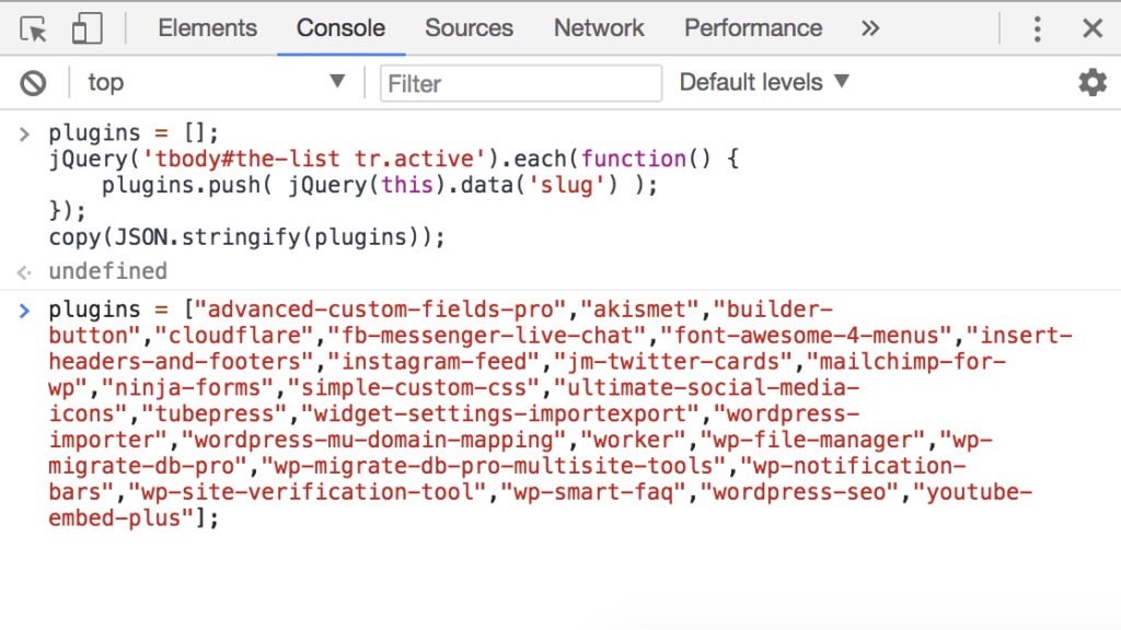 With Chrome DevTools open, type in plugins = then paste the list of the plugins which was put there from the previous command. Then run following JS code which will automatically select those plugins within cPanel.