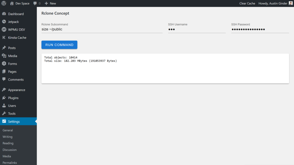 Then update the file wp-content/plugins/rclone-concept/rclone-concept.php to this code: https://gist.github.com/austinginder/783802bd617fb9d18fd0ac0c716304ea. This will add a new page on the WordPress backend where you can enter an Rclone subcommand, SSH username, SSH password and then see the response.