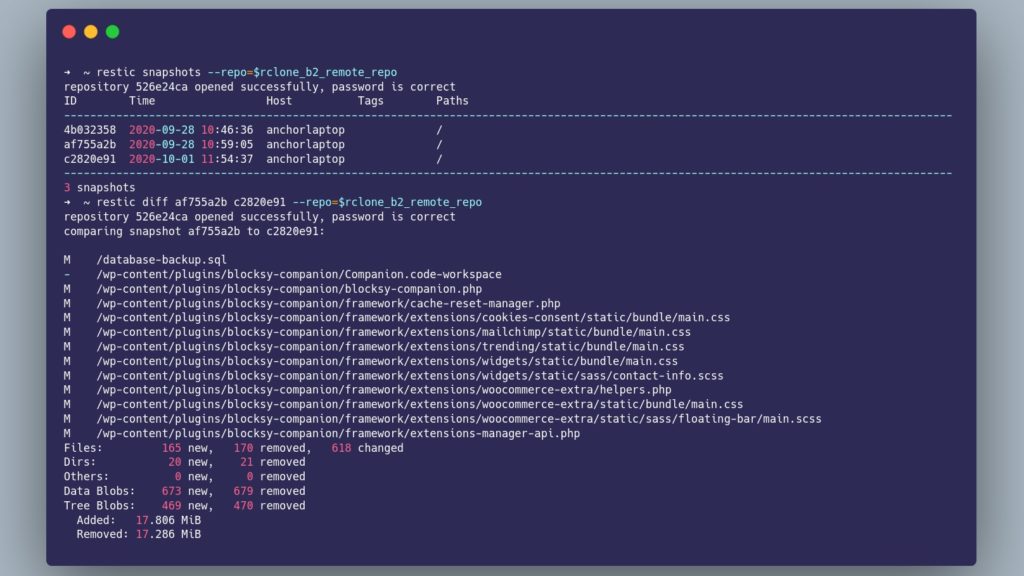 Rclone can efficiently sync files between virtually any cloud provider, and is what I use to perform my incremental backups. Restic allows you to incrementally send data to a backup repository. This is very different than Rclone, as Rclone syncs individual files. Restic stores unique data blocks. Restic is ideal for long-term storage as data flowing into the backup repository is de-duplicated and encrypted. That means you can make multiple backups of an entire WordPress site using very little storage overhead with full restoration capabilities.