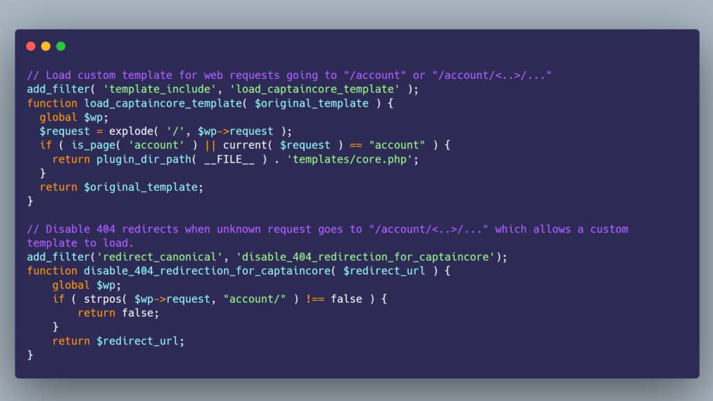The second part is to disable WordPress’ built in 404 redirection. If a request is not found, WordPress falls back to its permalink structure. That means a request going to something like account/unknown_page might get changed to post/unknown_page which would not be helpful. The redirect_canonical filter can be used to disable this redirection, thus allowing the original request to fallback to the custom template as defined above.