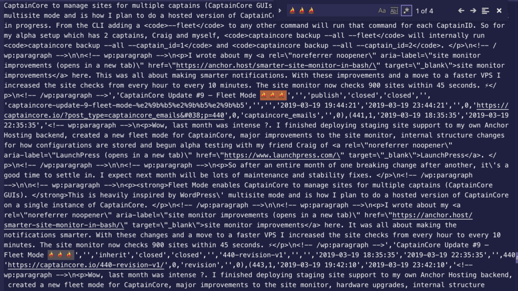 grep --include "*.sql" -rn "🚤" wp-content/