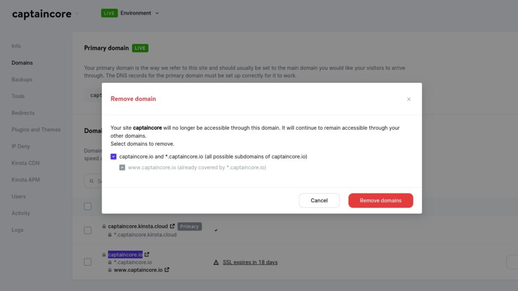 Next, remove domain mappings for the current domain. This will remove the wildcard SSL and take the website offline.